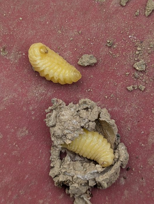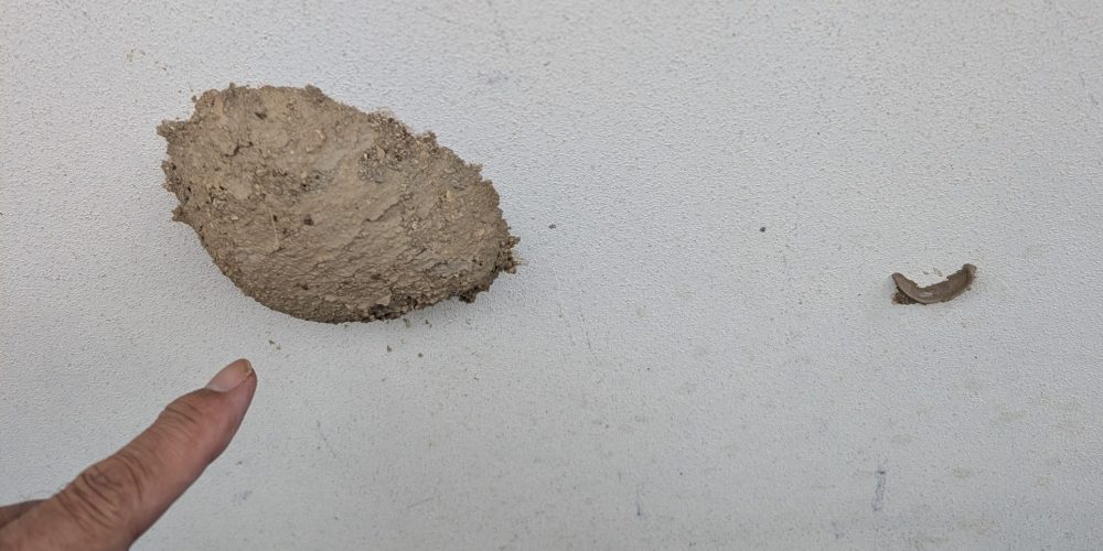 小さな徳利型の巣は時折見かけますが、10cmほどもある巣は初めてです。ベランダのある2階の外壁にへばりついているのを、10月に気付いていたのですが、なんとなく可哀想で、そのままにしておいたのですが、中には、まだいるのかな。年の瀬の大掃除で、取り外すことに。とても固いので、金ベラを使って削り取りました。中からは、さなぎ状態の幼虫が5匹ほどでてきました。これだけの巣をこしらえた親バチの苦労と生き物の命を思うと、ちょっと落ち込んでしまう師走の朝でした。ごめんなさい。