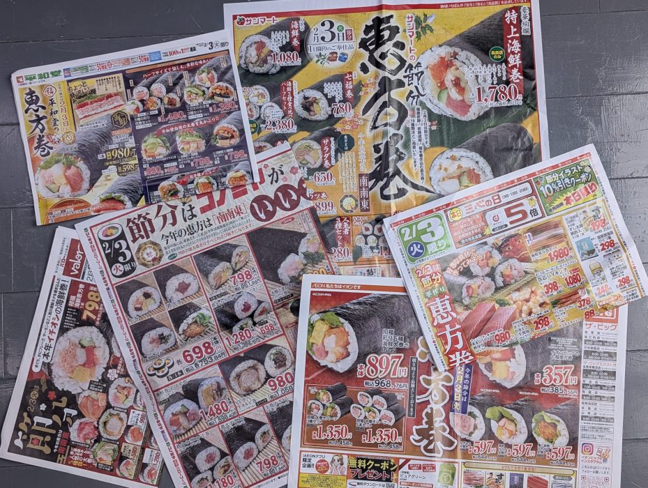 スーパーの新聞折り込みチラシは、恵方巻だらけ。そんなに需要があるのか不思議ですが、普段配られてこない地域のスーパーも一緒に入っています。