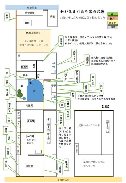 “中の間”には、帳場机も置かれていましたが、もっぱら居間として、使用人も一緒に食卓を囲みました。“奥の間”は、主人の寝床。床の間には、布袋様が天を指す置物が置かれ、“中の間”への欄間あたりに、横長長尺の額に入れられた水墨画(餓鬼を鍾馗様が追いかける図)が掛かり、応接室は、ちょいとした生け花の洋画が飾られ、クラシックな応接椅子2客とテーブルが配され、庭の眺めを楽しむことができました。筧から落ちる水の音、鉢に陽が射しきらきらと光り、金魚が群れて泳いでいました。池の水は、応接間の縁の下まで満ちていました。隠し階段で2階に上がると、庭の風景がまた違って見え、高木の緑豊かに風に揺れています。道側の2カ所の窓から覗こうとすると、天井高は子どもでも頭を打つほど低い。格子がはめられていましたが、結婚式の際は、格子を外し、菓子撒きしたものです。