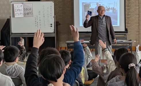 この日は、先生の幼いころからの親友が、58歳で脳梗塞により体が不自由になったケースを例に取り上げ、病に倒れた時の親友の顔がどんな表情だったかを、児童たちにイメージして描いてもらいました。