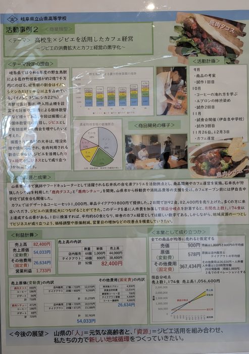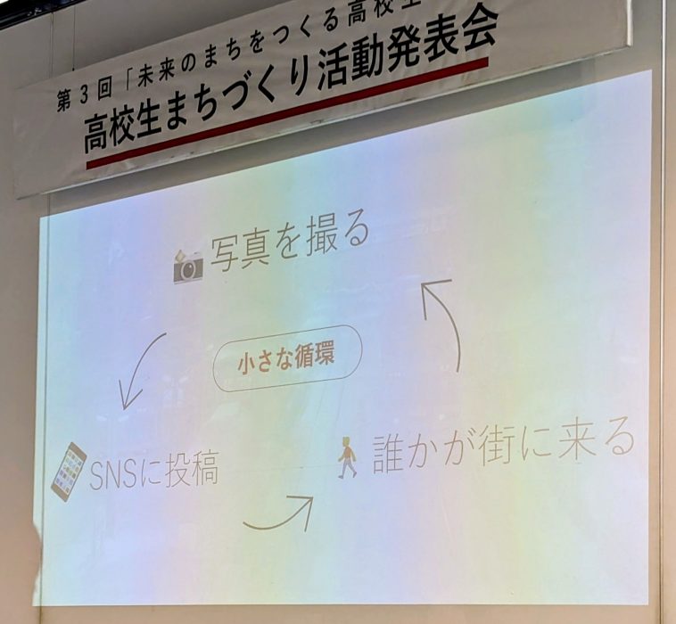トップを飾った加納高等学校の発表を見てみましょう。SNSを活用した情報発信の事例は、若者ならではの手法と感性が濃縮されたものでした。例えば、川原町を例に、「インスタを使った訪問者へのアンケート調査」、「チラシ、ガイドマップ、ロゴマークそして3本の動画を制作し、SNSで発信する」という手法は、実際にまちづくりの現場で活用できそうです。